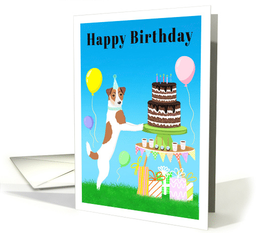 This lively Jack Russell Terrier is the life of the party, ready to bring joy and energy to any birthday celebration! Dressed for fun and surrounded by party cheer, this spirited pup stands beside a delicious chocolate cake, colorful cake pops, and festive party cups filled with soda. Known for their high energy, clever minds, and playful personalities, Jack Russells are always up for a good time—making them the perfect companion for a birthday bash. This card is a great pick for dog lovers, pet parents, or anyone who enjoys a bit of fun, mischief, and sweetness on their special day.