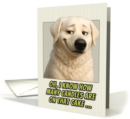This birthday card features a realistic portrait of an adorable Kuvasz dog. The dog has expressive brown eyes and a smirk on it's face.The portrait is set against a cream-colored background with subtle vertical pinstripes. Below the dog's image, green text with black outlines reads: "OH, I KNOW HOW MANY CANDLES ARE ON THAT CAKE..." This creates the same humorous birthday message about age awareness, but now from a dog's perspective. The card plays on the idea that pets are always watching and observing their owners, turning this into a playful joke about birthday candle counting and getting older. Perfect card for dog parents, dog lovers, people who appreciate gentle age humor, milestone birthdays, and people who enjoy cards with attitude and personality.
