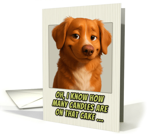 | Artist Notes: | This birthday card features a realistic portrait of an adorable Nova Scotia Duck Tolling Retriever dog. The dog has expressive brown eyes and a smirk on it's face.The portrait is set against a cream-colored background with subtle vertical pinstripes. Below the dog's image, green text with black outlines reads: "OH, I KNOW HOW MANY CANDLES ARE ON THAT CAKE..." This creates the same humorous birthday message about age awareness, but now from a dog's perspective. The card plays on the idea that pets are always watching and observing their owners, turning this into a playful joke about birthday candle counting and getting older. Perfect card for dog parents, dog lovers, people who appreciate gentle age humor, milestone birthdays, and people who enjoy cards with attitude and personality. |