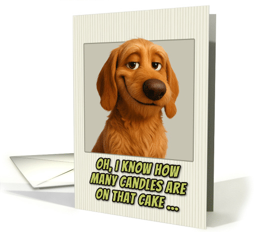 This birthday card features a realistic portrait of an adorable Basset Fauve de Bretagne dog. The dog has expressive brown eyes and a smirk on it's face.The portrait is set against a cream-colored background with subtle vertical pinstripes. Below the dog's image, green text with black outlines reads: "OH, I KNOW HOW MANY CANDLES ARE ON THAT CAKE..." This creates the same humorous birthday message about age awareness, but now from a dog's perspective. The card plays on the idea that pets are always watching and observing their owners, turning this into a playful joke about birthday candle counting and getting older. Perfect card for dog parents, dog lovers, people who appreciate gentle age humor, milestone birthdays, and people who enjoy cards with attitude and personality.