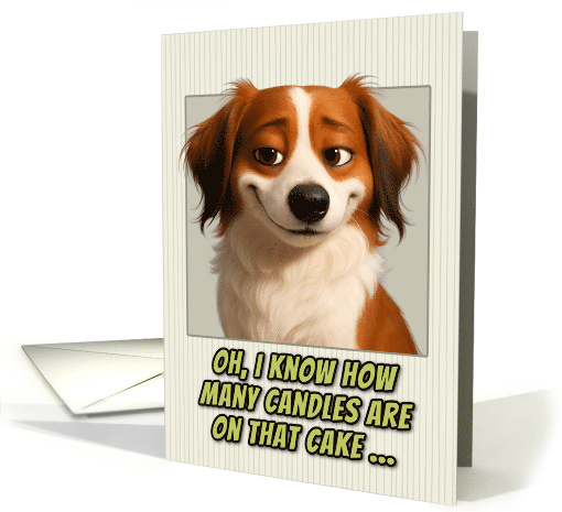 This birthday card features a realistic portrait of an adorable Kooiker hondje. The dog has expressive brown eyes and a smirk on it's face.The portrait is set against a cream-colored background with subtle vertical pinstripes. Below the dog's image, green text with black outlines reads: "OH, I KNOW HOW MANY CANDLES ARE ON THAT CAKE..." This creates the same humorous birthday message about age awareness, but now from a dog's perspective. The card plays on the idea that pets are always watching and observing their owners, turning this into a playful joke about birthday candle counting and getting older. Perfect card for dog parents, dog lovers, people who appreciate gentle age humor, milestone birthdays, and people who enjoy cards with attitude and personality.