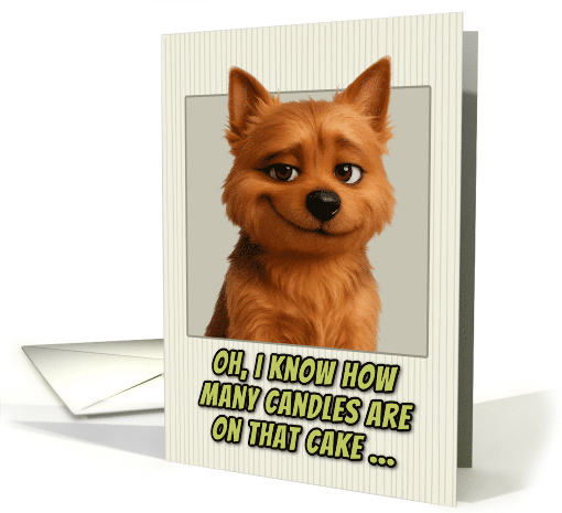 This birthday card features a realistic portrait of an adorable Norwich Terrier dog. The dog has expressive brown eyes and a smirk on it's face.The portrait is set against a cream-colored background with subtle vertical pinstripes. Below the dog's image, green text with black outlines reads: "OH, I KNOW HOW MANY CANDLES ARE ON THAT CAKE..." This creates the same humorous birthday message about age awareness, but now from a dog's perspective. The card plays on the idea that pets are always watching and observing their owners, turning this into a playful joke about birthday candle counting and getting older. Perfect card for dog parents, dog lovers, people who appreciate gentle age humor, milestone birthdays, and people who enjoy cards with attitude and personality.