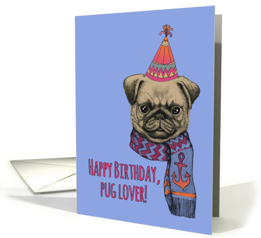 | Title: | Happy Birthday, Pug Lover! Cute pug, chevron scarf, party hat. |