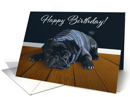 | Artist Notes: | This "Happy Birthday" card features a painting of an adorable black pug laying on a hardwood floor, looking directly at the viewer. |