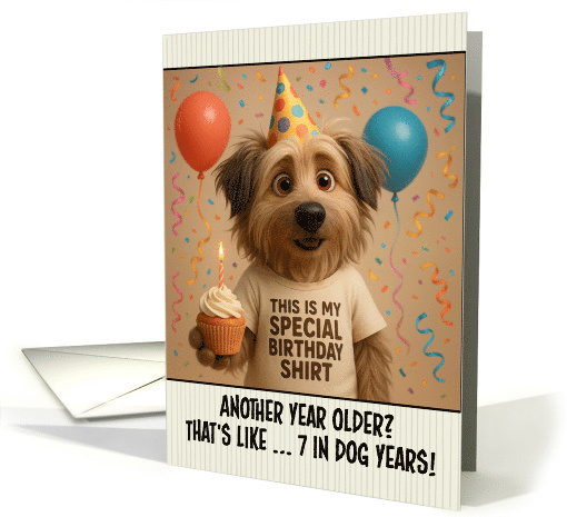 This birthday card features a whimsical, digitally illustrated cartoon of a Pyrenean Shepherd dog. The dog is wearing a colorful party hat and a t-shirt that reads "THIS IS MY SPECIAL BIRTHDAY SHIRT." The dog is holding a cupcake with cream frosting and a lit birthday candle. The background shows a festive party scene with colorful balloons, along with streamers and confetti. At the bottom of the card is a humorous message in a bold, handwritten-style font that reads: "ANOTHER YEAR OLDER? THAT'S LIKE... 7 IN DOG YEARS!" - playing on the common notion that dogs age faster than humans. The card has a creamy, striped border at the top and bottom, framing the colorful celebration scene. It's a playful, lighthearted birthday card that uses dog humor to make light of aging.
