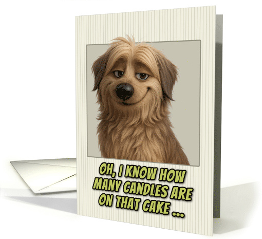This birthday card features a realistic portrait of an adorable Pyrenean Shepherd dog. The dog has expressive brown eyes and a smirk on it's face.The portrait is set against a cream-colored background with subtle vertical pinstripes. Below the dog's image, green text with black outlines reads: "OH, I KNOW HOW MANY CANDLES ARE ON THAT CAKE..." This creates the same humorous birthday message about age awareness, but now from a dog's perspective. The card plays on the idea that pets are always watching and observing their owners, turning this into a playful joke about birthday candle counting and getting older. Perfect card for dog parents, dog lovers, people who appreciate gentle age humor, milestone birthdays, and people who enjoy cards with attitude and personality.