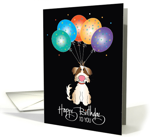 | Artist Notes: | "Happy Birthday to You" is the white curly and swirly hand lettering, at the base of this birthday card from a favorite pet dog. Right above, a brown miniature schnauzer sits, holding five oval inflated polka dot balloons in celebration of a special birthday. The balloons are colored green, blue, orange, red and purple and tied to the top knot on the schnauzer's head. The inside wording of the card says "Birthday wishes from a favorite dog!" |