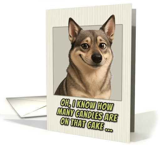 This birthday card features a realistic portrait of an adorable Swedish Vallhund. The dog has expressive brown eyes and a smirk on it's face.The portrait is set against a cream-colored background with subtle vertical pinstripes. Below the dog's image, green text with black outlines reads: "OH, I KNOW HOW MANY CANDLES ARE ON THAT CAKE..." This creates the same humorous birthday message about age awareness, but now from a dog's perspective. The card plays on the idea that pets are always watching and observing their owners, turning this into a playful joke about birthday candle counting and getting older. Perfect card for dog parents, dog lovers, people who appreciate gentle age humor, milestone birthdays, and people who enjoy cards with attitude and personality.