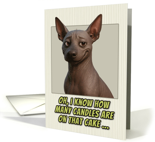 This birthday card features a realistic portrait of an adorable xoloitzcuintly dog. The dog has expressive brown eyes and a smirk on it's face.The portrait is set against a cream-colored background with subtle vertical pinstripes. Below the dog's image, green text with black outlines reads: "OH, I KNOW HOW MANY CANDLES ARE ON THAT CAKE..." This creates the same humorous birthday message about age awareness, but now from a dog's perspective. The card plays on the idea that pets are always watching and observing their owners, turning this into a playful joke about birthday candle counting and getting older. Perfect card for dog parents, dog lovers, people who appreciate gentle age humor, milestone birthdays, and people who enjoy cards with attitude and personality.