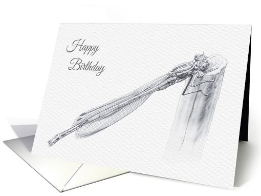 This card depicts a Blue Damsel Fly drawn from a photograph taken while it was resting on a reed, by my garden pond, while recovering from hunting. The Damsel Fly is numerous in the UK and bothe the common blue and red ones can be found frequenting ponds and lakes during the summer months. Although found in the same locations as the Dragonfly they are quite different, being smaller in girth and folding their wings backwards when at rest (the Dragon fly’s wings are at right angles to its body when at rest).