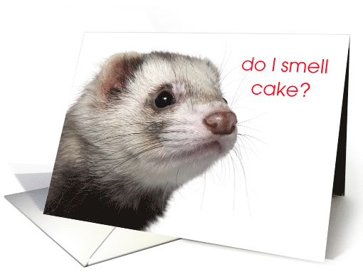 Give this fun ferret birthday card to that special person. The cover features a cute, brown, black and white ferret on a white background. The headline is red at the top of the card. The inside message may be changed if you wish. ©Gail Pepin