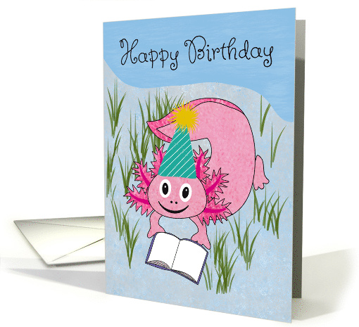 | Artist Notes: | This delightful birthday card features a charming pink axolotl wearing a party hat, engrossed in a book, and radiating a smile. The background is a serene water edge adorned with lush grassy sand and rocky terrain. |
