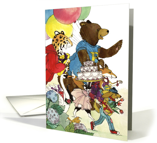 | Artist Notes: | Wish a special kid in your life happy birthday with this fun illustration of animals; Bear, Dog, Cat Fox, Swan & Jaguar running with cake, balloons & gifts. |