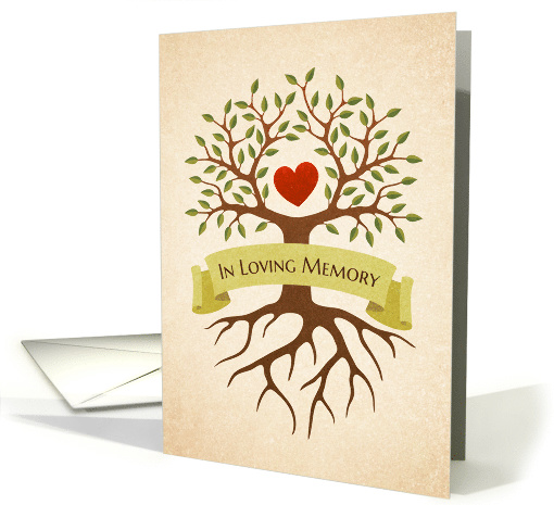| Artist Notes: | Remembrance/anniversary of loss card featuring a beautiful tree with branches surrounding a red heart. Across the trunk of the tree is a banner with the text "In loving memory". Customizable text inside: "Our thoughts are with you on this anniversary of your loss. May you find comfort and peace now, and in the days ahead" |