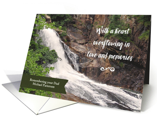 | Artist Notes: | Card to remember the anniversary of the passing of a friend or family member's father. Background is a photo of a lovely waterfall with verse that reads, "With a heart overflowing in love and memories" Customize green faux burlap banner with deceased dad's name. |