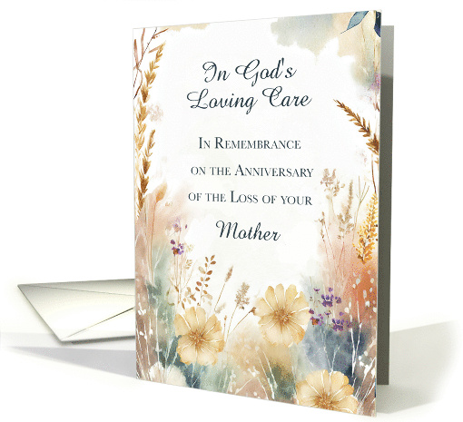 | Artist Notes: | A mother’s love is forever, and on this anniversary of loss, faith can be a source of comfort. This elegant remembrance card features a soft cream background with wildflowers in natural hues gently embracing the heartfelt message. Offering prayers and blessings, this design serves as a tender way to remind someone that God’s love holds both them and their beloved mother close. |