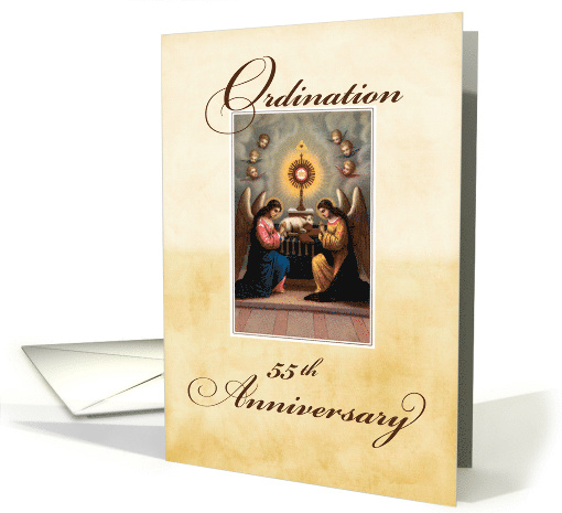 A 55th ordination anniversary is a wonderful jubilee year for a priest. This card shows two angels kneeling at the altar, with the blessed sacrament exposed with the altar of the lamb of God. Beautiful card to give a priest on his 55th Anniversary celebration!