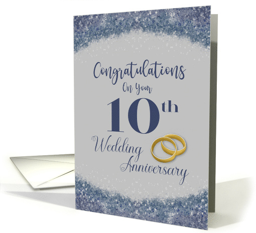 Honor a couple's 10th anniversary by sending this "Congratulations on Your 10th Wedding Anniversary" card. Silver and blue mark the colors for this particular year, and this card showcases a faux glitter border in those hues. A gold set of wedding rings tops off the design.