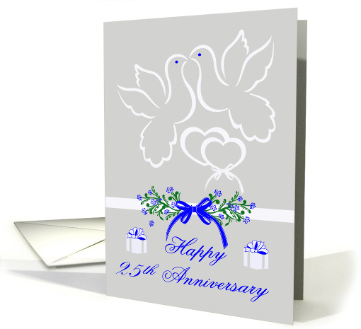Wish any couple in general a Happy 25th Anniversary with a couple of doves kisses over joining hearts. Background is a pretty grayish blue with flowers, a bow and presents.