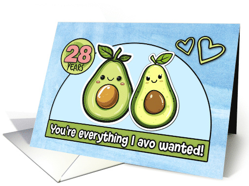 Two kawaii cartoon avocados on a light blue watercolor background with the text '28 years You're everything I avo wanted!' A sweet pun card to send to the happy couple for their 28-year wedding.anniversary.