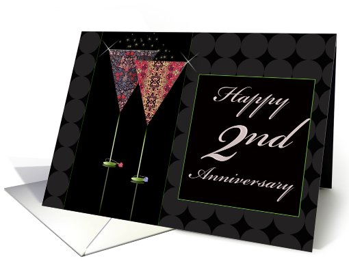 Two colorful wine glasses with bubbles and sleek black background with Happy 2nd Anniversary in light silver font. Perfect for the second wedding anniversary!