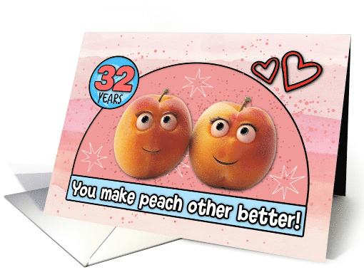 | Artist Notes: | A pair of smiling peaches together on a pink and peach watercolor background with a splatter pattern, stars and hearts and the text "32 years You make peach other better!" A sweet card to send to the happy couple for their 32-year wedding anniversary. |