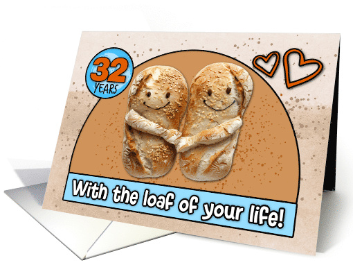 | Artist Notes: | A pair of smiling bread loafs with sesame seed sprincles are holding hands on a beige and brown watercolor background with a splatter pattern and hearts and the text "32 years With the loaf of your life!" A sweet card to send to the happy couple for their 32-year wedding anniversary. |