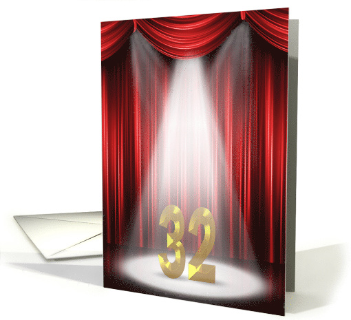 | Artist Notes: | Gold 32 text in bright stage spotlight with red curtain backdrop for 32nd wedding anniversary. |