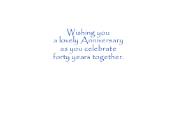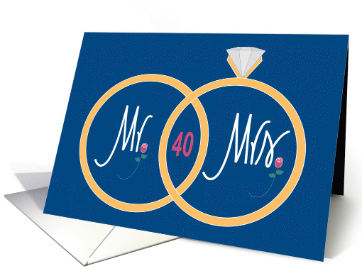 What a wonderful celebration a 40th Wedding Anniversary is. A celebration such as this deserves a wonderfully stunning and brilliantly meaningful card, such as this lovely one. Two enlarged wedding rings, one of the groom and one of the bride, with a diamond topping it, overlap at the middle of this elegantly rich peacock blue card. The groom's ring has the white hand lettered word "Mr." inside and the bride's rings has the word "Mrs." inside, as well as a diamond that glistens at the top. Where the two rings overlap, is the number "40" in a rich mauve color. The inside wording for this elegant card is "Wishing you a lovely Anniversary as you celebrate forty years together."