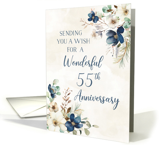 Happy 55th anniversary greeting card with beautiful floral arrangements in blue and white with a heartfelt message.
