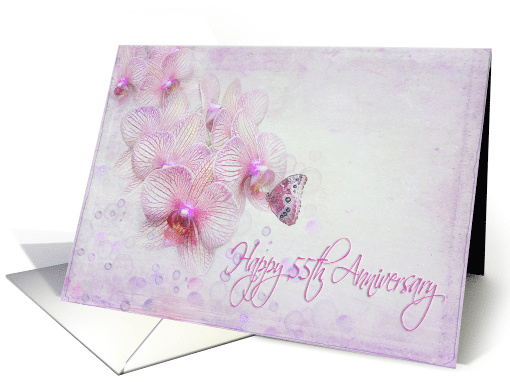 Pink orchid blossom and butterfly on soft pink textured background with bubbles for 55th wedding anniversary.