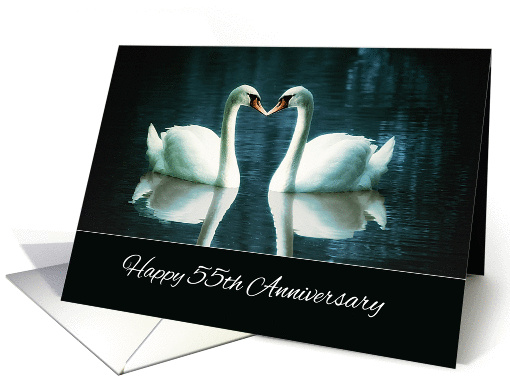 Send stylish "Happy 55th Wedding Anniversary" wishes with this card, featuring two beautiful swans (and their reflections on the ripples of a blue lake) gazing at each other, their necks forming a heart.