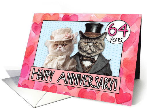 | Artist Notes: | Two exotic shorthair cats as a victorian-era bride and groom, both wearing hats, on a light blue background and a watercolor hearts border in various shades of pinks and peach with the text 'Happy Anniversary! 64 years' A sweet card to send to the happy couple for their 64-year wedding anniversary. |