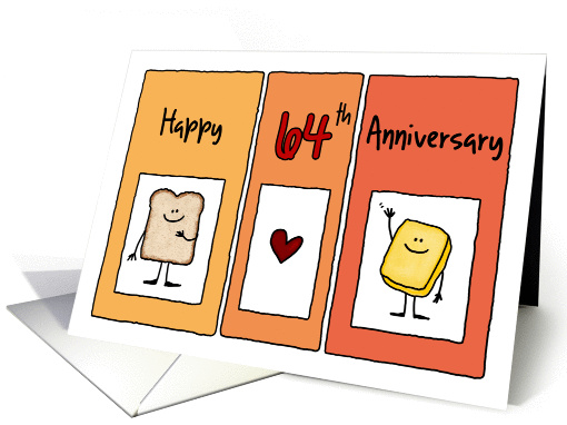 | Artist Notes: | An adorable cartoon kawaii slice of bread, a heart and a pat of butter in hand drawn colored frames on colorful orange background with the text "Happy 64th Anniversary". A cute Anniversary card to send to your 'butter half'. |