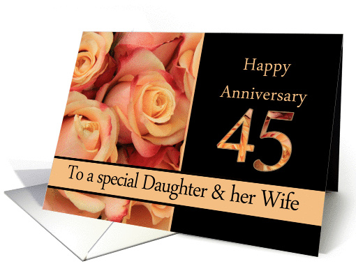 45th Anniversary Card to a wonderful Daughter and her Wife. Surprise them on their special day with this multicolored pink roses anniversary card. This anniversary card is available for many different (family) relations in some non-english languages and for many different anniversary years. Search for "Studio Porto Sabbia" and "multicolored pink roses anniversary" to find more available versions of this card.