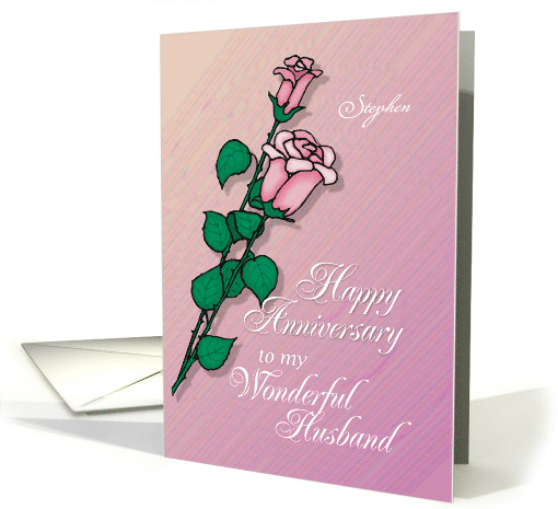 Two pink long stemmed roses grace the front of the card, with a textured looking watercolor gradient background. Make this a very personal card for your husband by adding his name. Wish him happy wedding anniversary and remind him of your continued love.