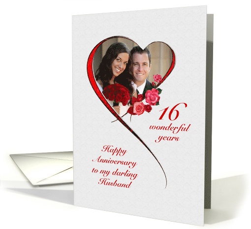 A very romantic and elegant 16th wedding anniversary card for your husband. Add a picture to make this card totally unique. A red heart surrounds your picture with red roses strewn around.