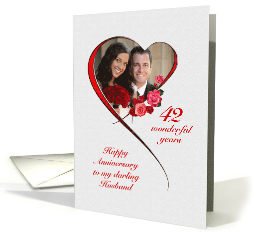 A very romantic and elegant 42nd wedding anniversary card for your husband. Add a picture to make this card totally unique. A red heart surrounds your picture with red roses strewn around.