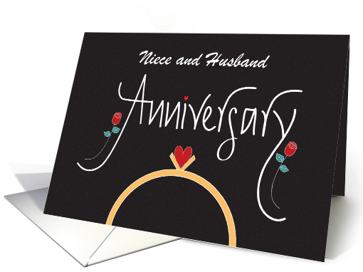 This lovely wedding anniversary card is able to be customized with any relation, as you order the card. It has the elegantly magnificent word "Anniversary" sweeping across the card is white hand lettering, with descenders on the first and last letters. Long stem red rose buds match the curve of these letters beautifully. At the bottom, a single wedding ring of a golden-color is topped with a red heart setting. Just type in the relation you are sending your card to, during ordering, at the very top of the card. The inside wording of the card says "Wishing you a very happy anniversary!"