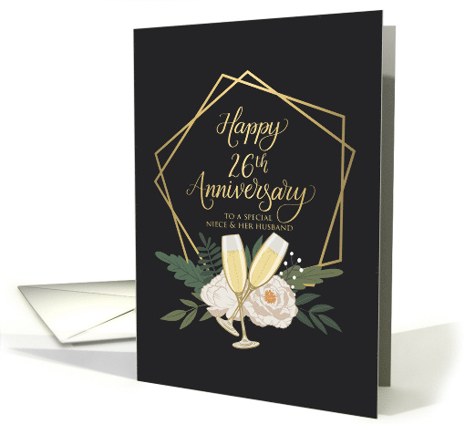 Send your wedding anniversary wishes with this lovely modern boho card illustrated with a faux gold geometric frame decorated with wine glasses, peonies, berries and leaves with the elegant faux gold hand lettered words 'Happy 26th Anniversary' by Ness to a special niece & her husband. © Ness Nordberg