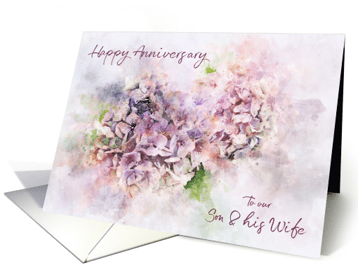 A splashy digital watercolor of two beautiful pink and lilac Hydrangea flower heads created from my original photograph. A really pretty card perfect for your Son and his Wife. © Ann Garrett