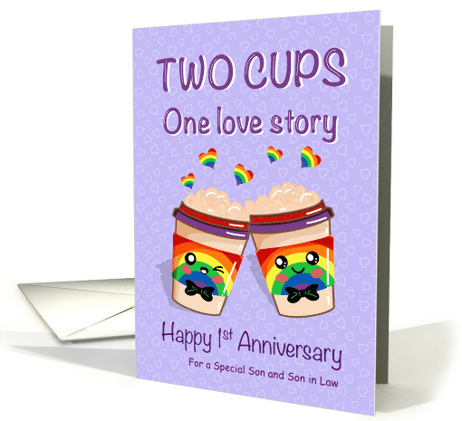 Two take-out style coffee cups with rainbow bands and adorable cartoon faces. Both have blushing cheeks and wear tiny black bow ties. Colorful hearts shaped like rainbows float above the cups. The purple background has a soft pattern of tiny hearts. Bold purple text at the top reads: “TWO CUPS,” followed by “One love story” in a playful script. At the bottom, it says: “Happy 1st Anniversary.” The overall tone is warm, cute, and inclusive, perfect for celebrating same-sex love.