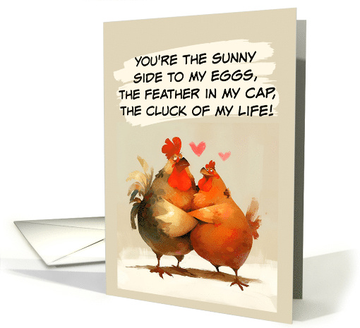 | Artist Notes: | A sweet cartoon rooster and hen are hugging each other in suspence on a beige background and the text 'you're the sunny side to my eggs, the feather in my cap, the cluck of my life! Such a sweet anniversary card to send to your significant other. |