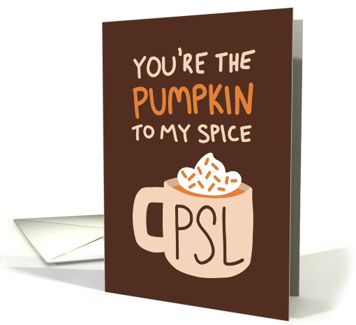 This cute, modern, and minimalist design with text "you're the pumpkin to my spice" has an illustration of a pumpkin spice coffee or latte with whipped cream.
