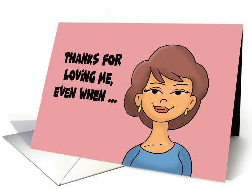| Artist Notes: | Adult Anniversary Card for a spouse, with a cartoon woman on a pink background. The words say: Thanks for loving me, even when ... Inside says: ... I'm in my crazy psycho bitch mode! Happy Anniversary |