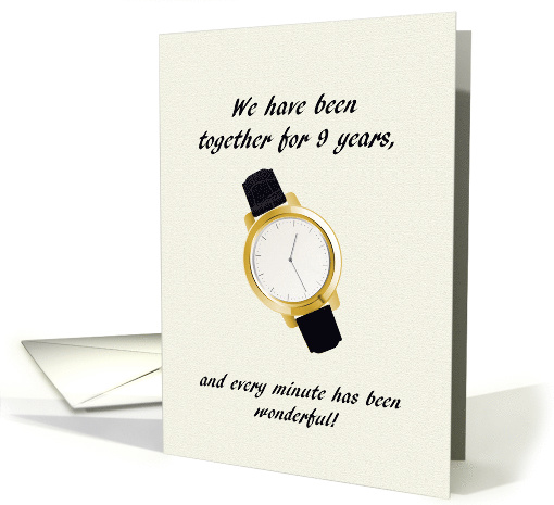 | Artist Notes: | 9th wedding anniversary card with a beautiful message. Tell your love that you have loved every minute together. A watch is ticking away the minutes, but they don't matter because you love being together. A very romantic anniversary card. |