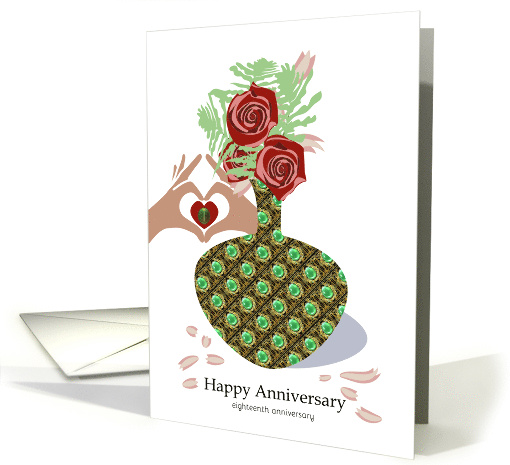 | Artist Notes: | Illustrated vase for an 18th anniversary. Two hands form a shape of the heart. The bouquet is made up of fern, red roses, and other blossoms. No physical embellishments, printed card only. The encrusted vase represents cat's eye chrysoberyl in the shape of cabochons. This gemstone is the modern association for 18 anniversary. |