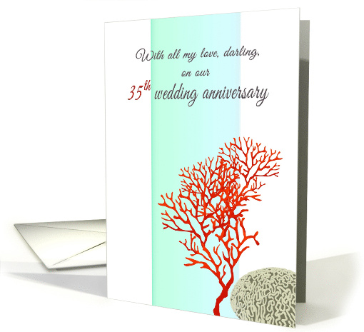 | Artist Notes: | Sea coral, in particular an orangey-red coral, feature in this design for a 35th (coral) wedding anniversary greeting for a spouse. A vertical banner in translucent bluish-green sits behind the image. |