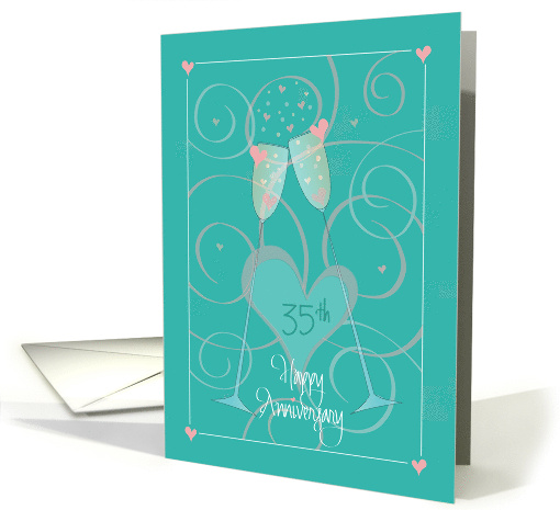 This beautiful Wedding Anniversary card for your spouse will celebrate your shared 35 years of marriage together and is a card that will be cherished by your wife or husband. The teal background makes the two toasting champagne glasses reminiscent of the wedding toasts you made to each other, at your wedding. Pink hearts fill the glasses, topping the glasses and mixing with all of the colorful bubbles, that rise out of each glass flute. The background's swirls of white and pink curl around tiny pink hearts, that match the corner hearts, along the card's white border. "Happy Anniversary" is hand lettered, in white, with a white and pink heart above, that contains the lettered "35th". The card's inside wording says "Happy 35th Anniversary to the love of my life. I'm so happy to be sharing my life with you!"