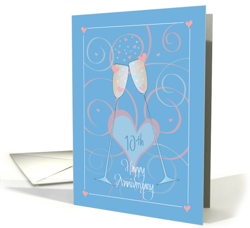 This lovely powder blue anniversary card for your spouse is a most beautiful way to wish your husband or wife a Happy 10th Anniversary. The card's two champagne glasses toast together in love, with hearts and bubbles filling and bubbling over the top of the two glasses. The blue background is filled with pink and white swirls, with intertwined swirling that are looped together, behind the glasses. The wording "10th" fills a large pink bordered heart that the two glasses share, with white hand lettered wording of "Happy Anniversary" written below. The card's inside wording to your spouse says "Happy 10th Anniversary to the love of my life. I'm so happy to be sharing my life with you."